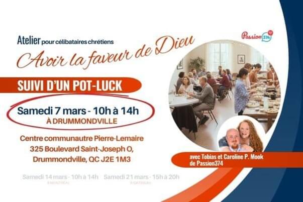 Prenons justement le temps de plonger dans les Écritures pour mieux comprendre ce sujet. Tobias et Caroline P. Mook de Passion374 nous partagerons ce qu’ils ont découvert sur le sujet, et ensuite, en petits groupes, nous continuerons à nous édifier dans la même direction. Le sujet est tellement bénissant que nous ne pouvions le faire qu’une fois, à une seule région du Québec. Nous présenterons donc le même atelier dans trois régions différentes, à trois dates différentes. C’est donc un rendez-vous à Drummondville le 7 mars, à Montréal le 14 mars, et à Gatineau le 21 mars.