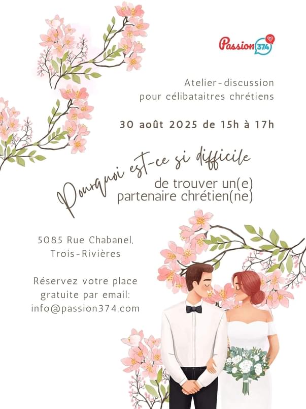 Pourquoi est-ce si difficile de trouver un(e) partenaire chrétien(ne)? Vraiment, cela semble beaucoup plus compliqué pour les célibataires non-chrétiens. Nous allons discuter des enjeux et essayer de trouver des solutions le 30 août prochain à Trois-Rivières.