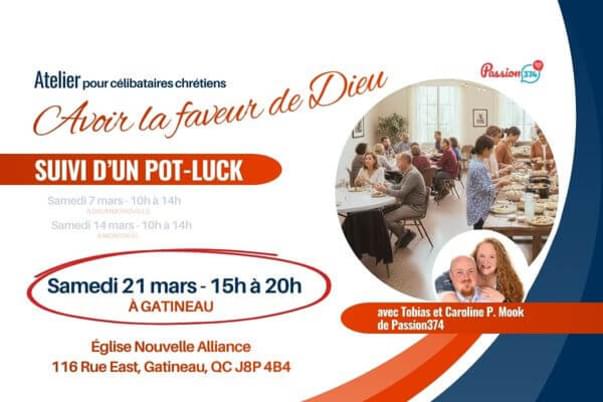 Chacun des ateliers sera suivi d’un repas de style pot-luck (un repas partage). Pour s’inscrire à l’atelier qui aura lieu à Gatineau, le samedi 21 mars à 15:00am, vous devez donc 1-Envoyer un email pour confirmer votre présence à outaouais@passion374.com 2-Inscrire dans ce document ce que vous allez apporter comme plat pour le pot-luck :https://www.quiquoi.fr/en/events/j9VG60p94Yo45kvtXyq14L